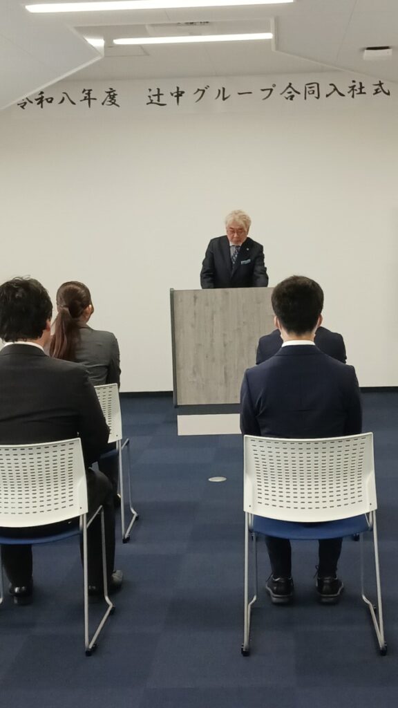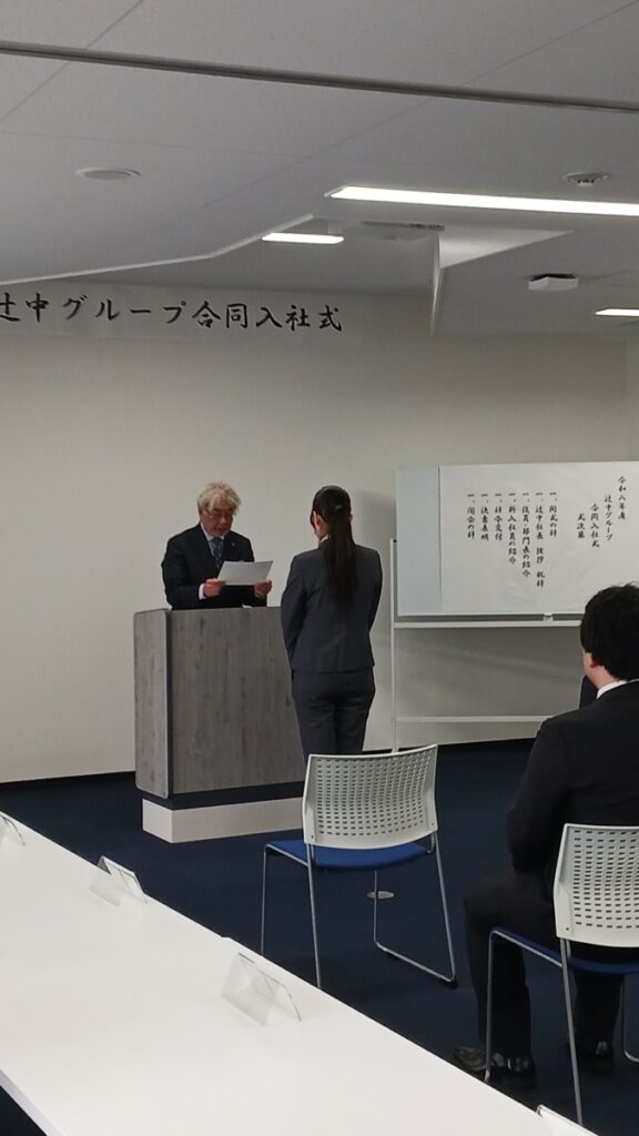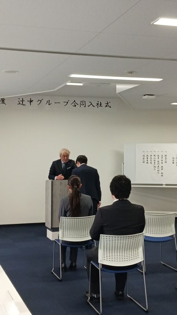 入社式は辻󠄀中グループ代表取締役 辻󠄀中弘敏の祝辞にはじまり、新入社員代表1名による決意表明で締めくくられました。
